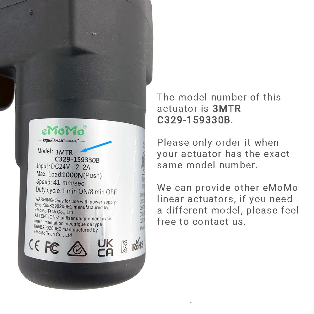 This actuator is a direct replacement for eMoMo 3MTR C329-159330B linear actuator. If your actuator’s model number is different, this actuator won’t be a suitable replacement.