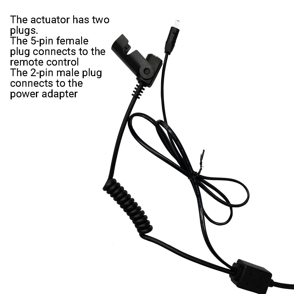 - This actuator has 2 plugs, one is 5 pin female round plug, it connects to the remote controller; the other one is 2 pin male plug, it connects to the power supply.