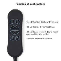 - The remote controller has six buttons, it controls the backrest raise/recline, seat lift up/down, legrest up/down.